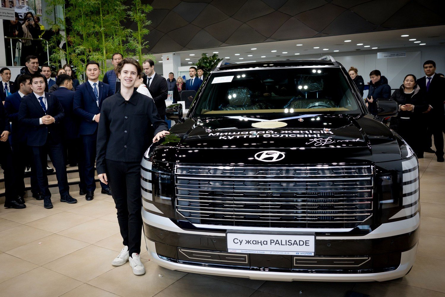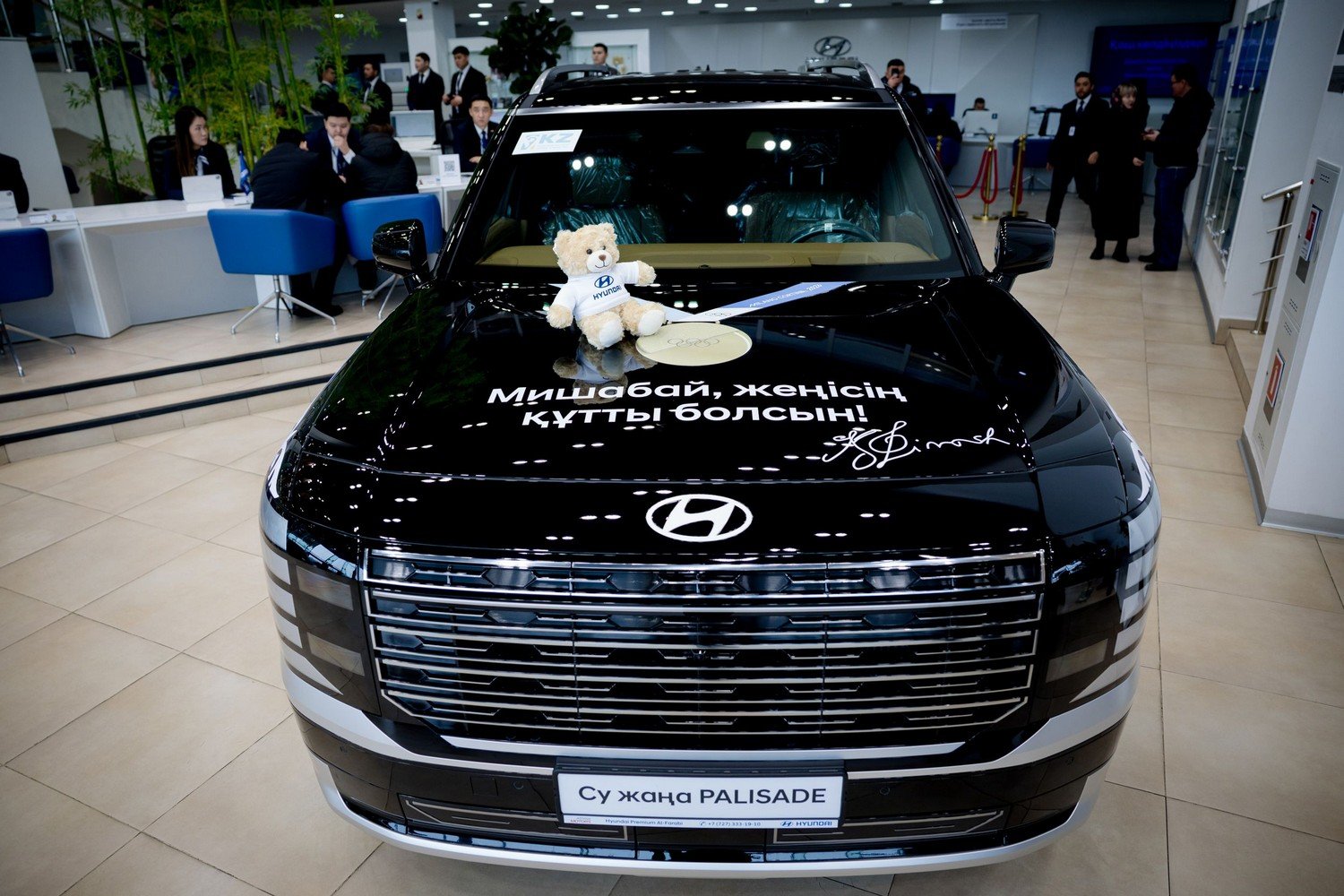 28 ақпан күні ерекше іс-шара өтті - Димаш Құдайберген Олимпиада чемпионы Михаил Шайдоровқа жаңа Hyundai Palisade автокөлігін салтанатты түрде табыс етті.